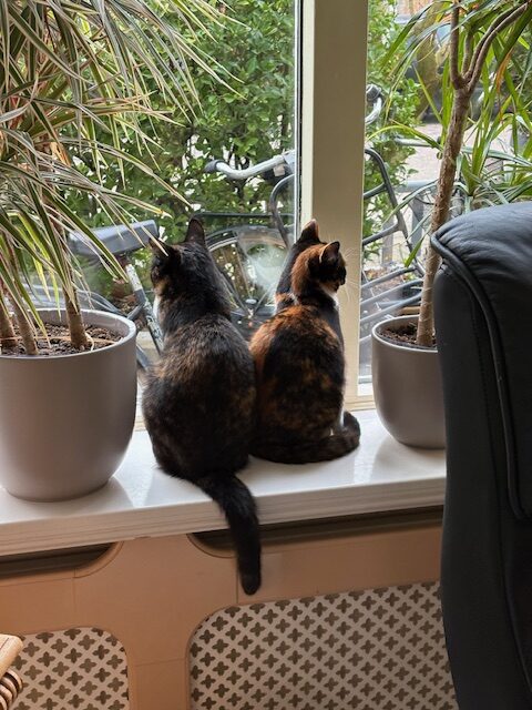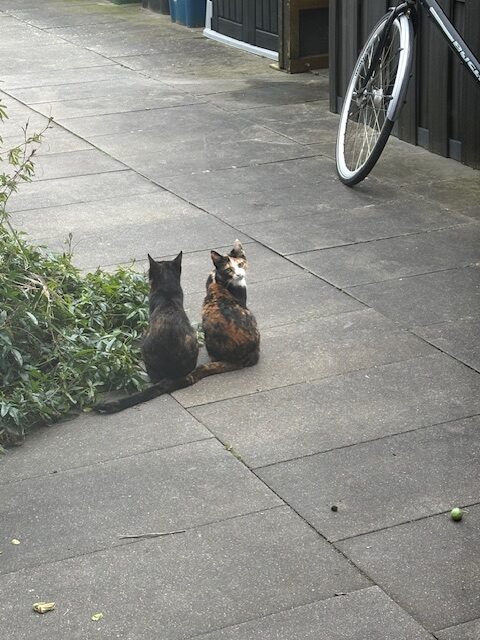 Elke avond liggen ze samen bij mij, Vlekje op schoot en Storm tegen mijn borst aan of vlak naast me. Vlekje komt ook bij anderen in de buurt, Storm alleen bij mij of nu ook soms bij mijn zoon. Een goede match!