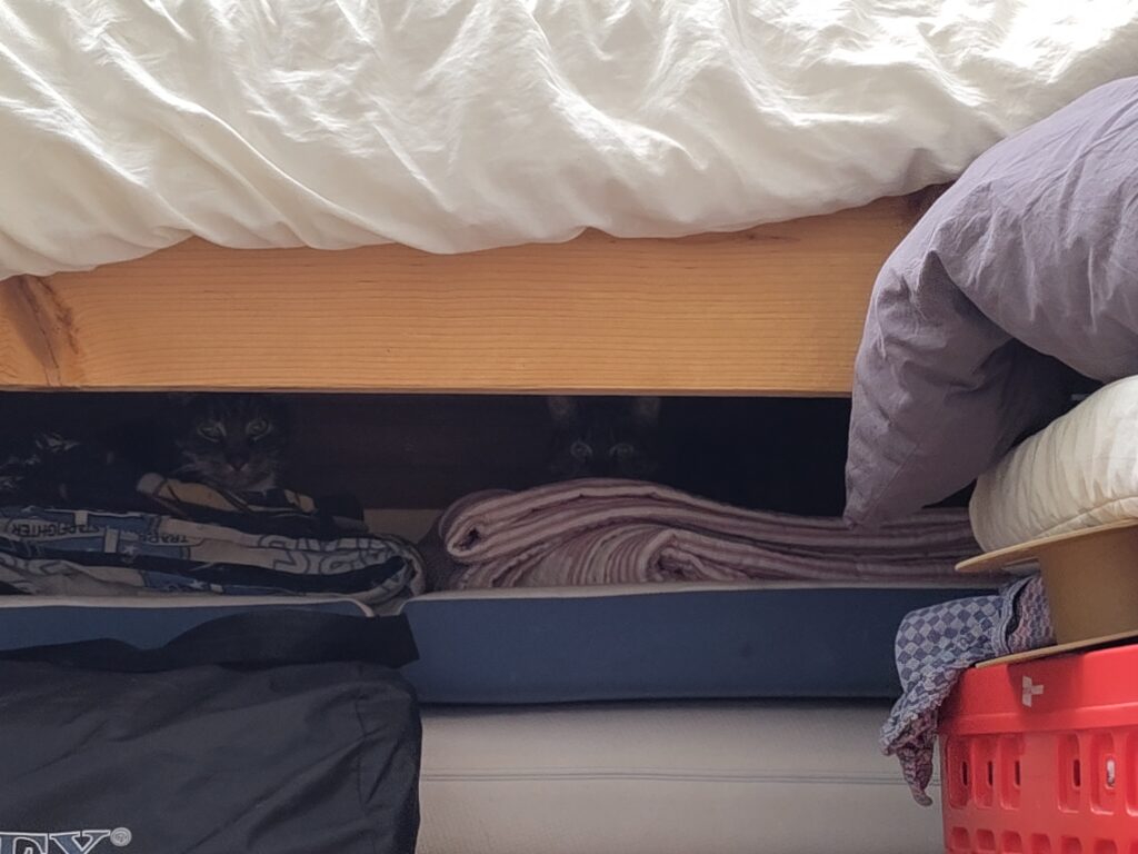 Het gaat heel goed met ze! Eerst een week of twee flink wennen, vooral voor Bella, die voornamelijk onder het bed zat (zie foto) en nog steeds wat schrikachtig is.