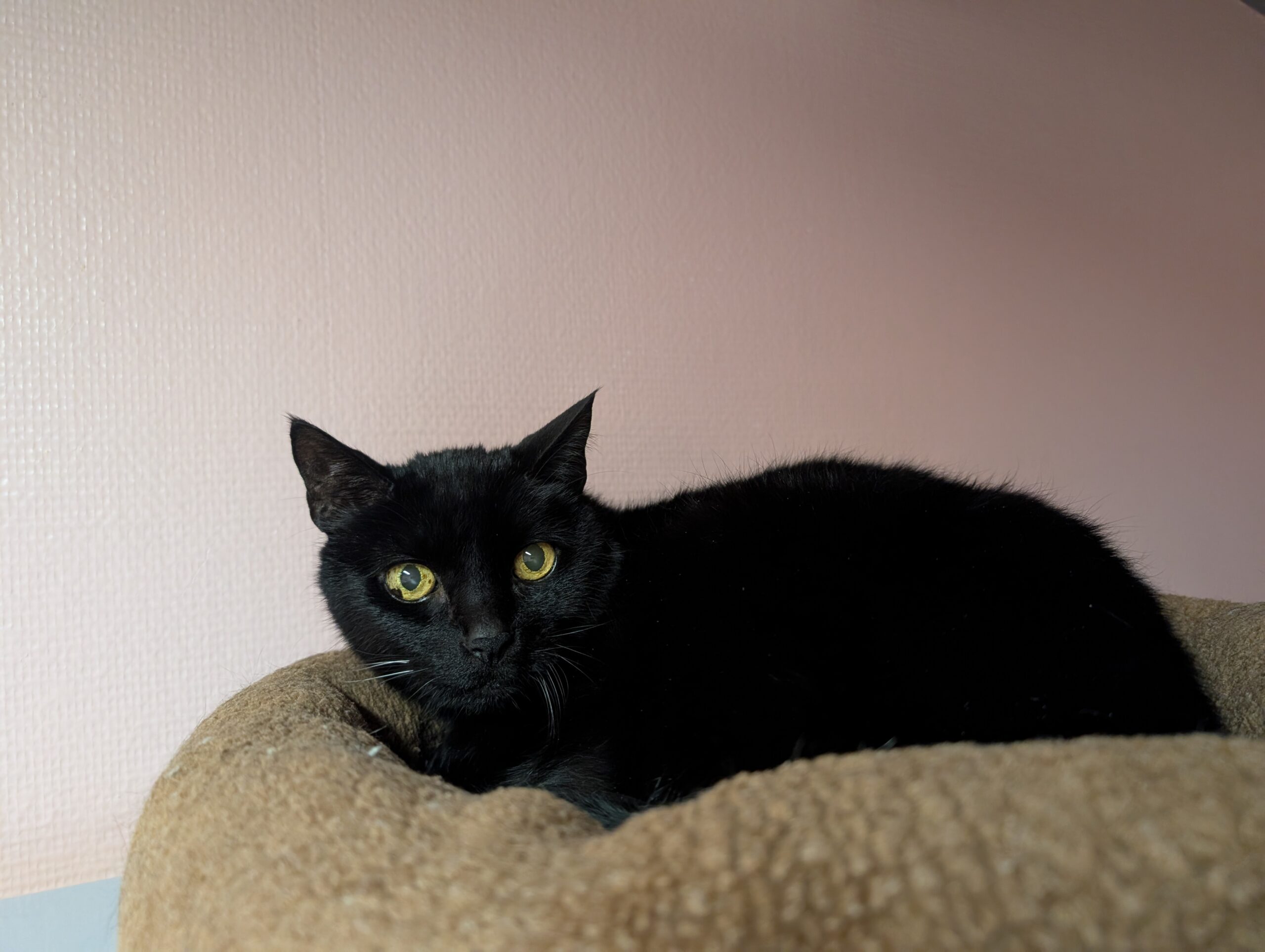 Mijn karakter is lief, bescheiden en verlegen. Ik lig hier vaak bovenop de kooien. Dat vind ik lekker rustig. Ik ben tenslotte een senior kater. Als ik je nog niet ken, ben ik wat terughoudend. Maar als ik je wat beter ken, kan jij mij rustig benaderen. Dan vind ik een knuffeltje heel fijn. Soms hoor je me dan ook spinnen. Lief toch!