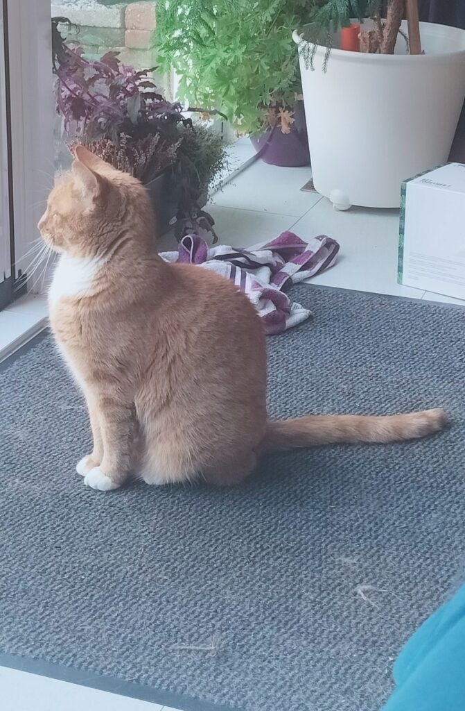 Cody was in het begin erg angstig voor alles, maar wilde wel heel graag aandacht zoals op de foto te zien is. Ook is hij heel nieuwschierig waardoor hij al snel op onderzoek uitgaat. Onze andere kat vond hem in het begin niet zo leuk, maar langzaamaan ging het steeds beter. Als zij nu binnenkomt dan geeft ze Cody kopjes en hij wast haar bovenop de kop.