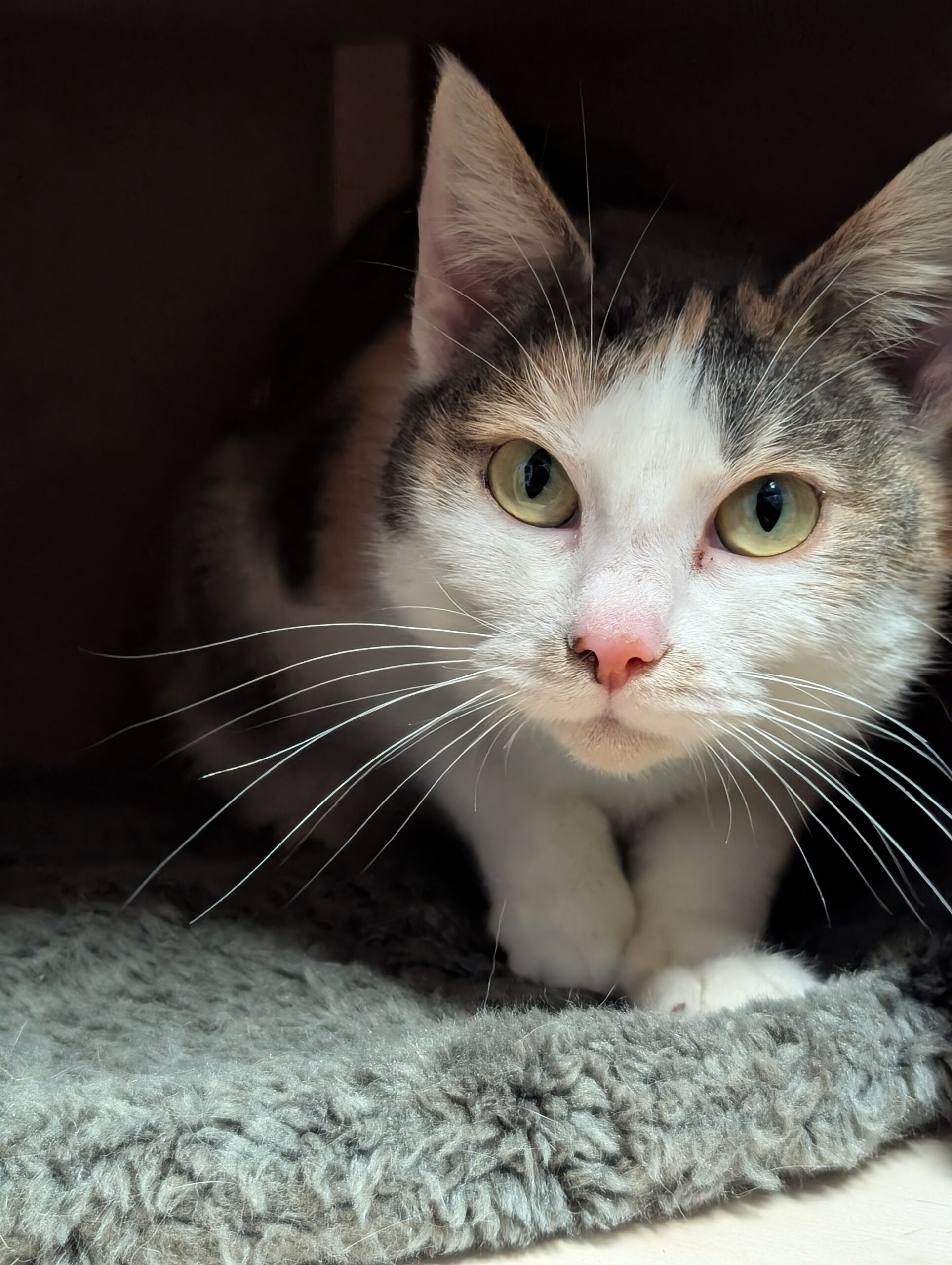 Zal ik wat over mezelf vertellen? Ik ben lief, aanhankelijk, rustig en verlegen. Maar als je lekker met mij knuffelt, geef ik je kopjes. Daarna ga ik heel hard spinnen. En kneed ik met mijn voorpootjes van plezier. Lief hè? Ik denk dat ik spelen heel leuk vind. Want ik ben nog hartstikke jong. Dus dat moet nog groeien. Wil jij samen met mij spelen? Dat lijkt me harstikke chill!