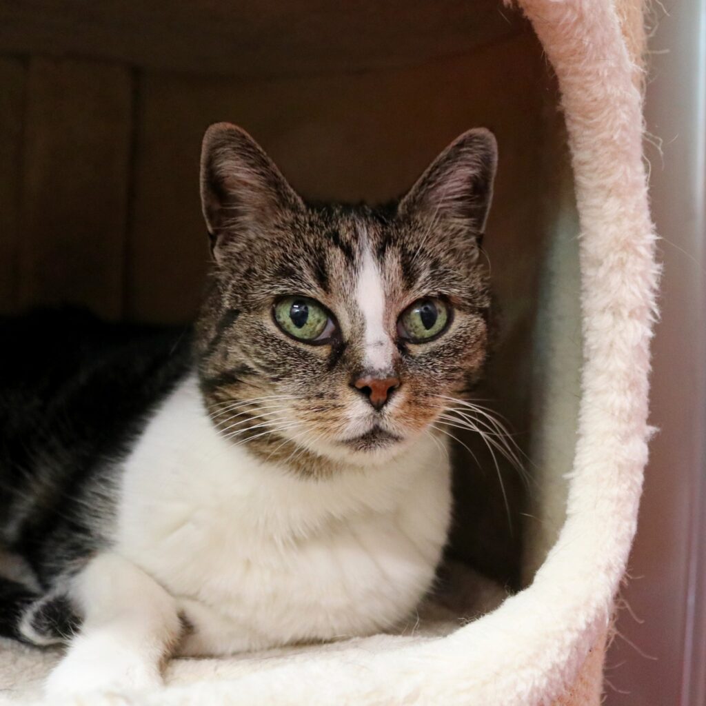 Hallo allemaal. Ik ben Kaatje. En ik zoek een maatje! Niet zomaar een maatje hoor. Nee, ik zoek iemand die mijn kopjes begrijpt. Mijn spinnende motortje waardeert. En die een klein plekje op de bank over heeft. Iemand die zegt: “kom eens hier, Kaatje”. En dan niet schrikt als ik meteen als een pluizige kruik op schoot plof. Hihi!