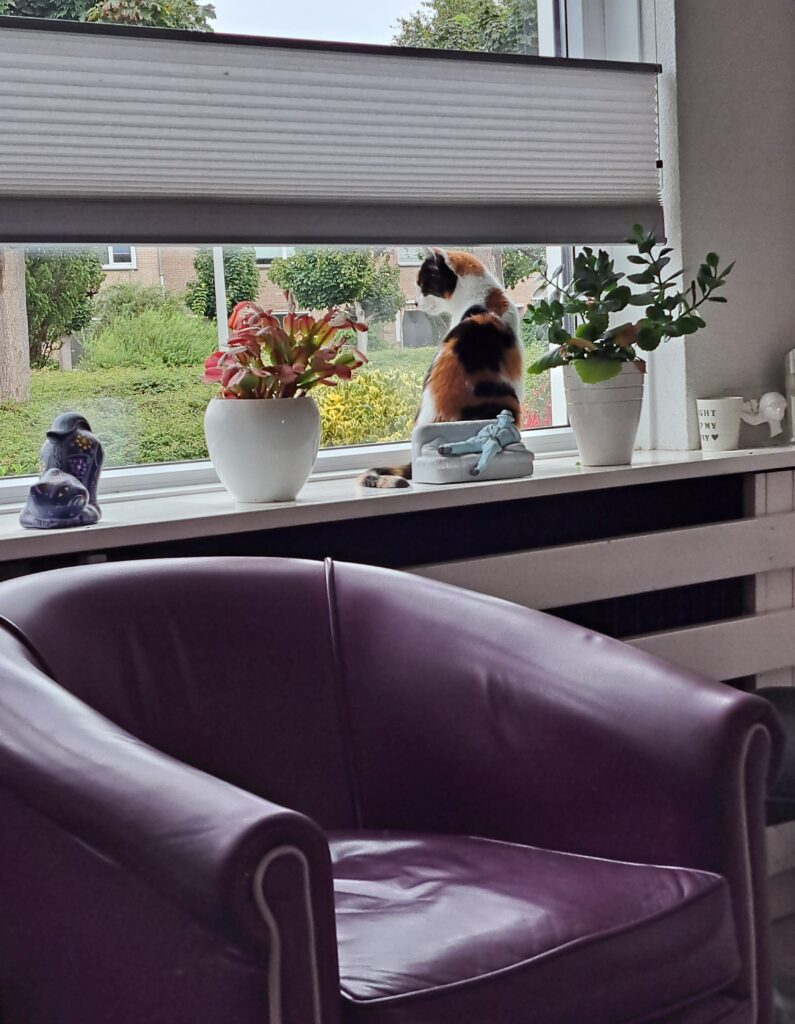 Als ik mijn rondje door de tuin heb gedaan, ga ik netjes voor het raam zitten wachten tot ze de keukendeur open komen doen. Want door een kattenluikje naar buiten gaan kan nog net, maar naar binnen door het luikje dat doe ik absoluut niet.