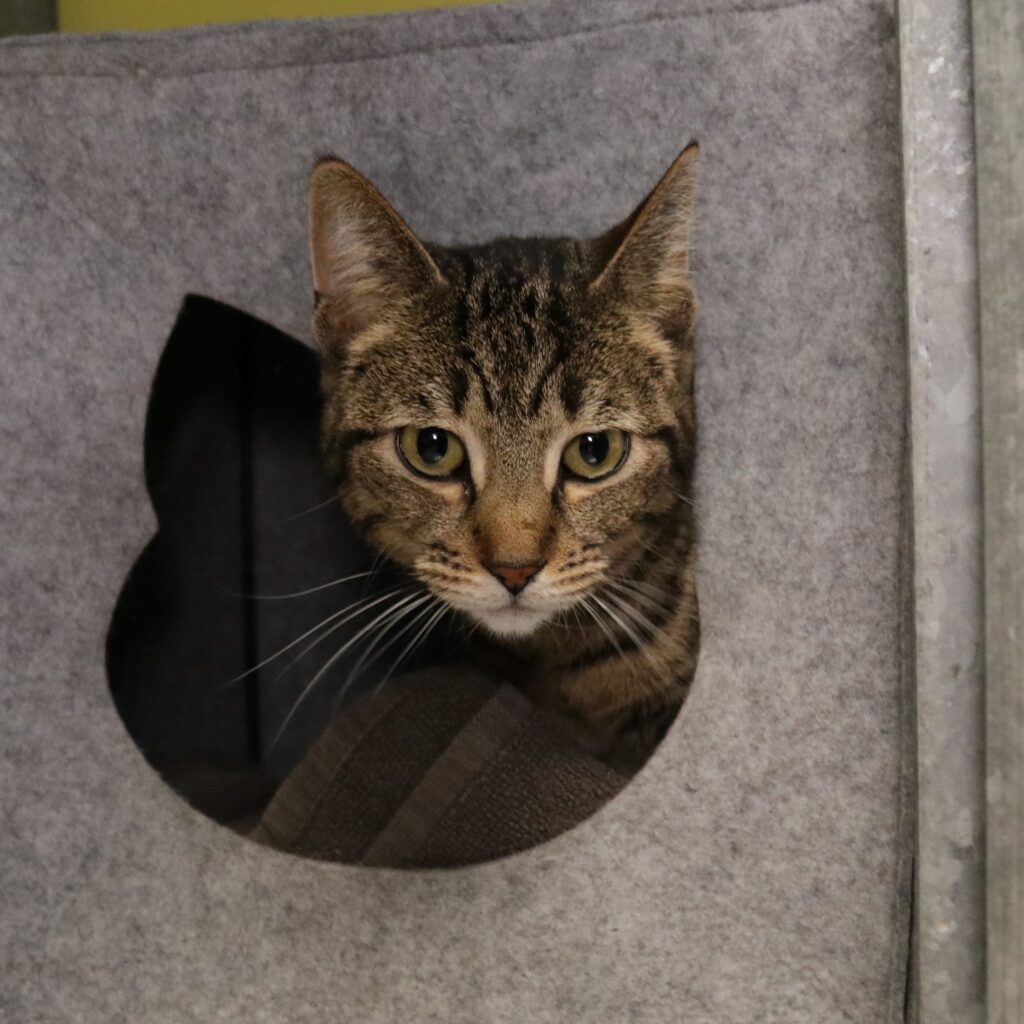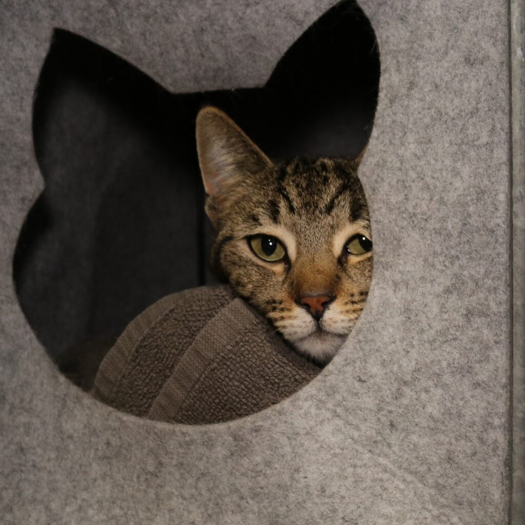 Taadaa, hier ben ik dan: poes Pip. Dat zeg ik altijd als ik uit m’n vilten schuilhuisje kom. Ik vind het namelijk heerlijk om me hierin te verstoppen. Soms kruip ik dan ook nog onder de handdoek die erin ligt. Dan ziet niemand mij, haha. En is de verrassing des te groter als ik tevoorschijn kom. Jaja, ik houd wel van een grapje!