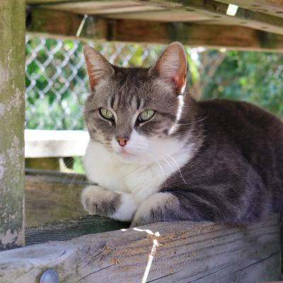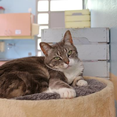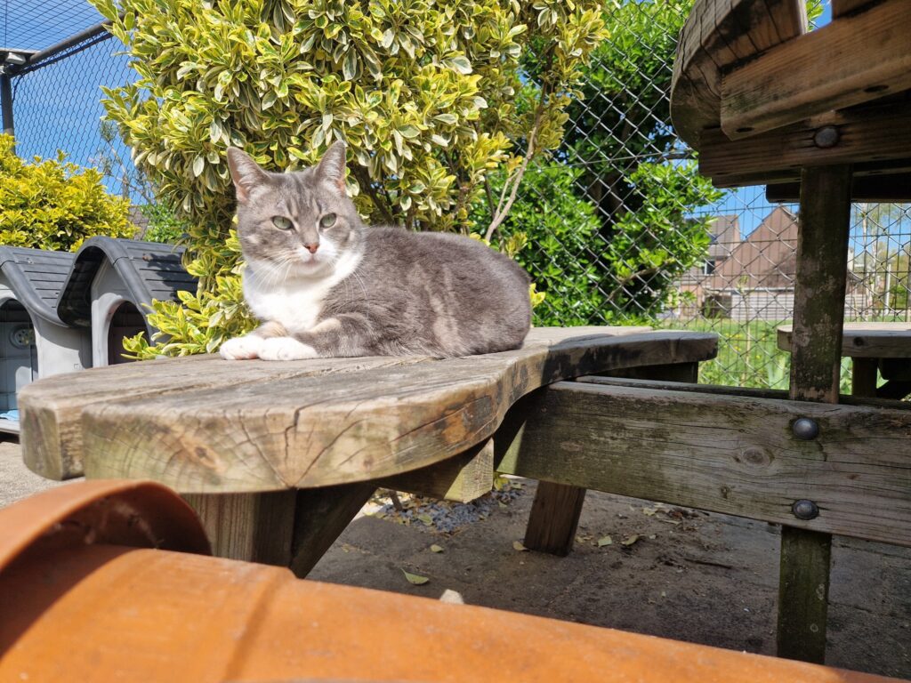 Ik woon nu voor de derde keer bij Zwerfdier. De eerste keer ben ik zwanger gevonden op een industrieterrein. Dat was in april 2021. Ik ben toen bij Zwerfdier bevallen van vier kittens. Toen mijn kindjes de deur uit waren ben ik zelf ook naar een eigen huisje gegaan. Maar ik was bang voor de andere kat die daar woonde. Daardoor durfde ik niet meer naar de kattenbak te gaan en deed ik alles onder de bank. Ik begreep wel dat ik daarom werd teruggebracht naar Zwerfdier.