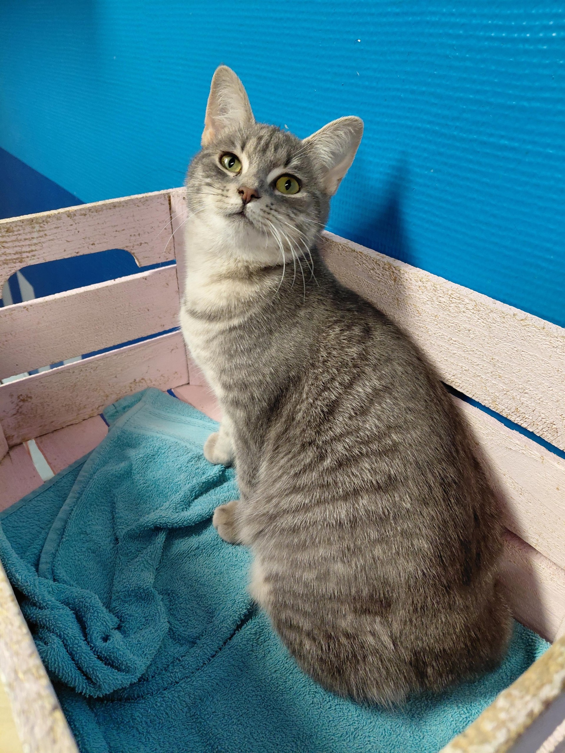 Samen met mijn moeder en nestgenootjes kwam ik bij Stichting Zwerfdier. Dit gebeurde via een uitwisseling met een bevriende dierenorganisatie. (In de tussentijd woonde ik bij een gastgezin). Bij binnenkomst was ik van slag. Maar liet mij wel goed benaderen. Inmiddels vind ik het allemaal best gezellig hier. Maar een eigen huisje is natuurlijk het tóppunt van gezelligheid!