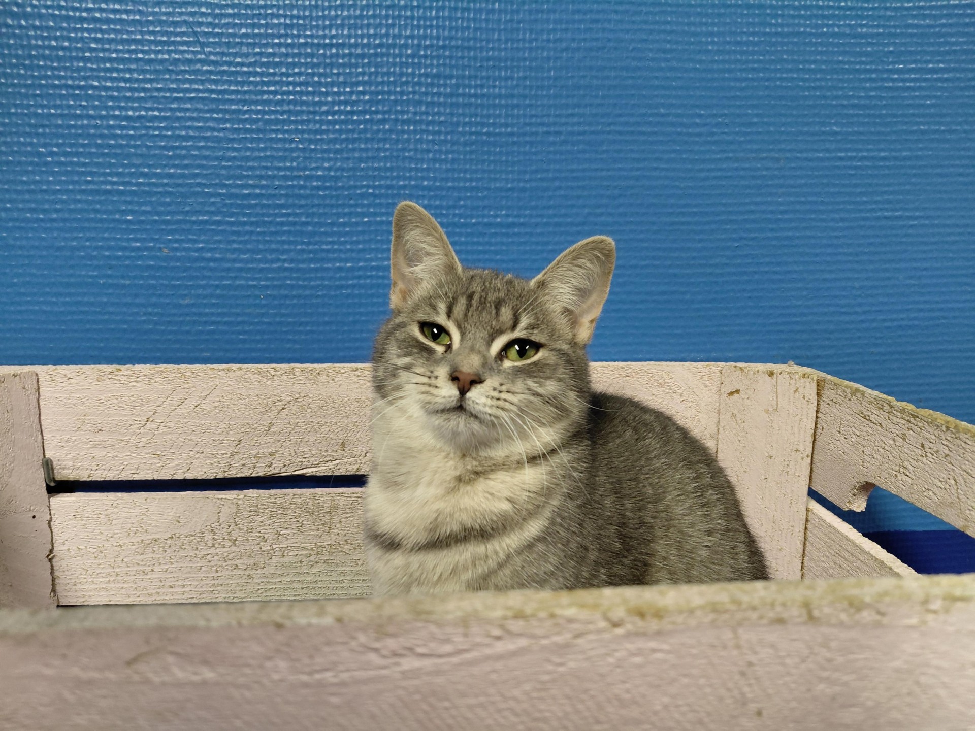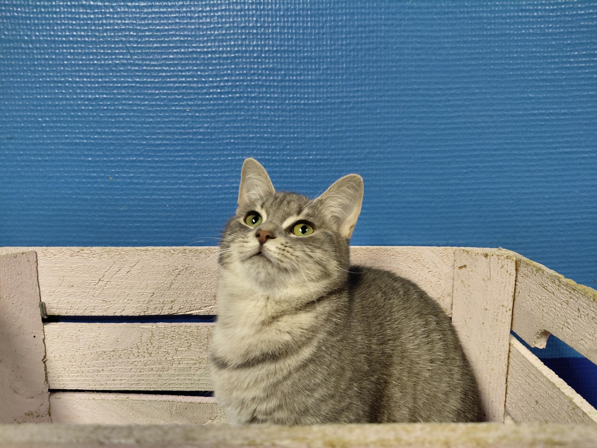 Joehoe, ik ben poesje Snuffie. Zie je mijn mooie gele oogjes en grijze vacht? En niet te vergeten mijn prachtige witte snorhaartjes? Dan poseer ik ook nog eens mooi voor de camera. Ja, ik weet wel hoe ik mijn toekomstige baasje(s) moet verleiden, hihi!