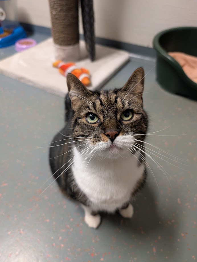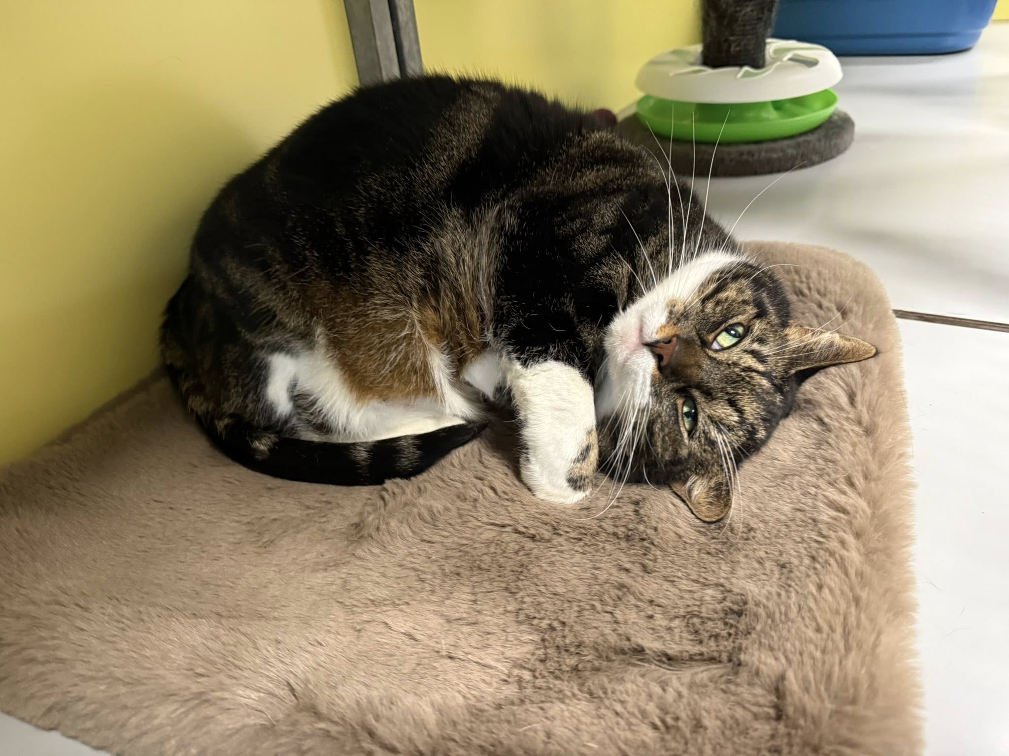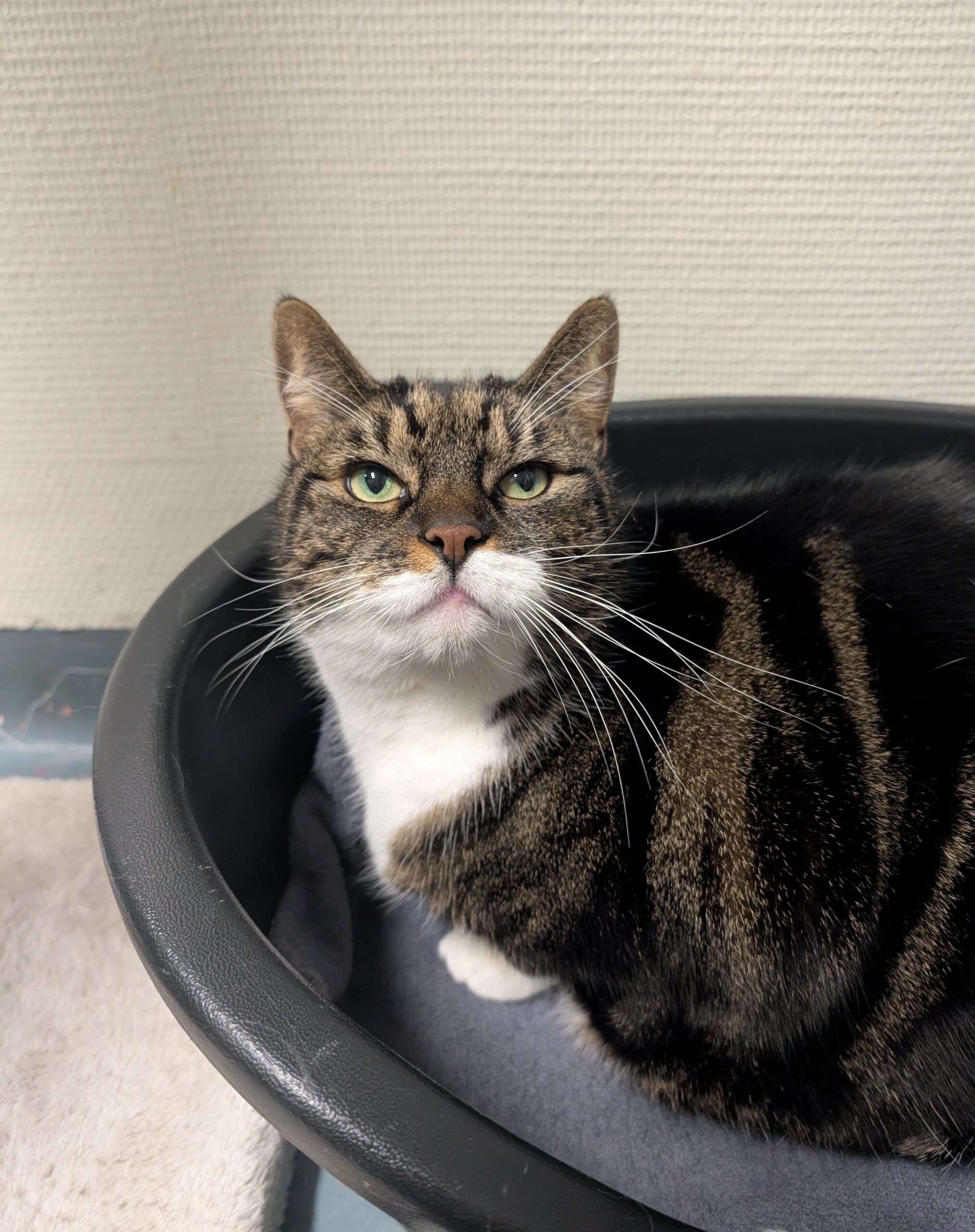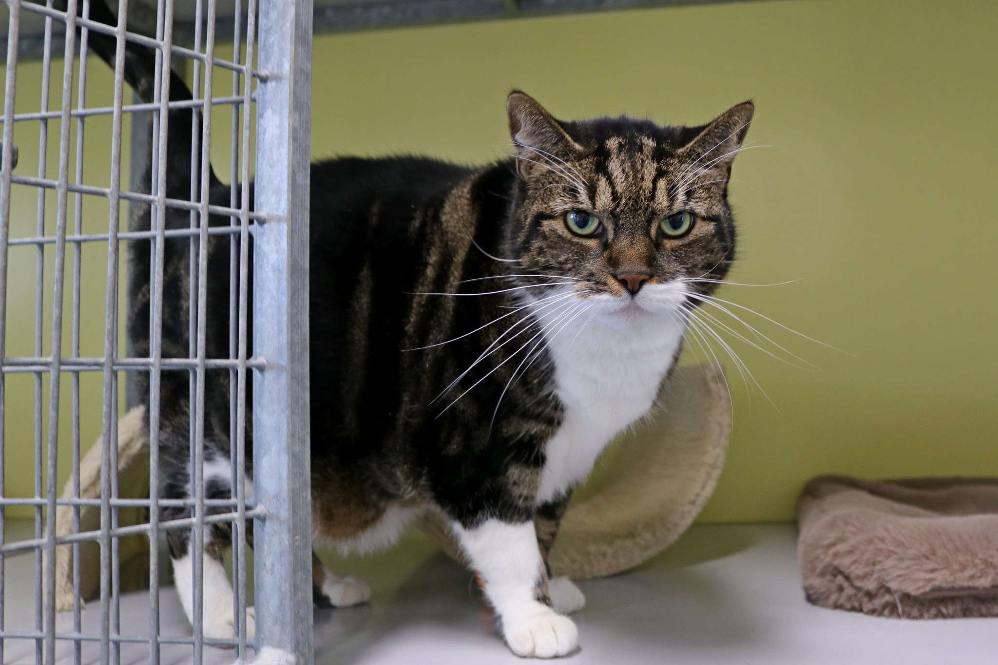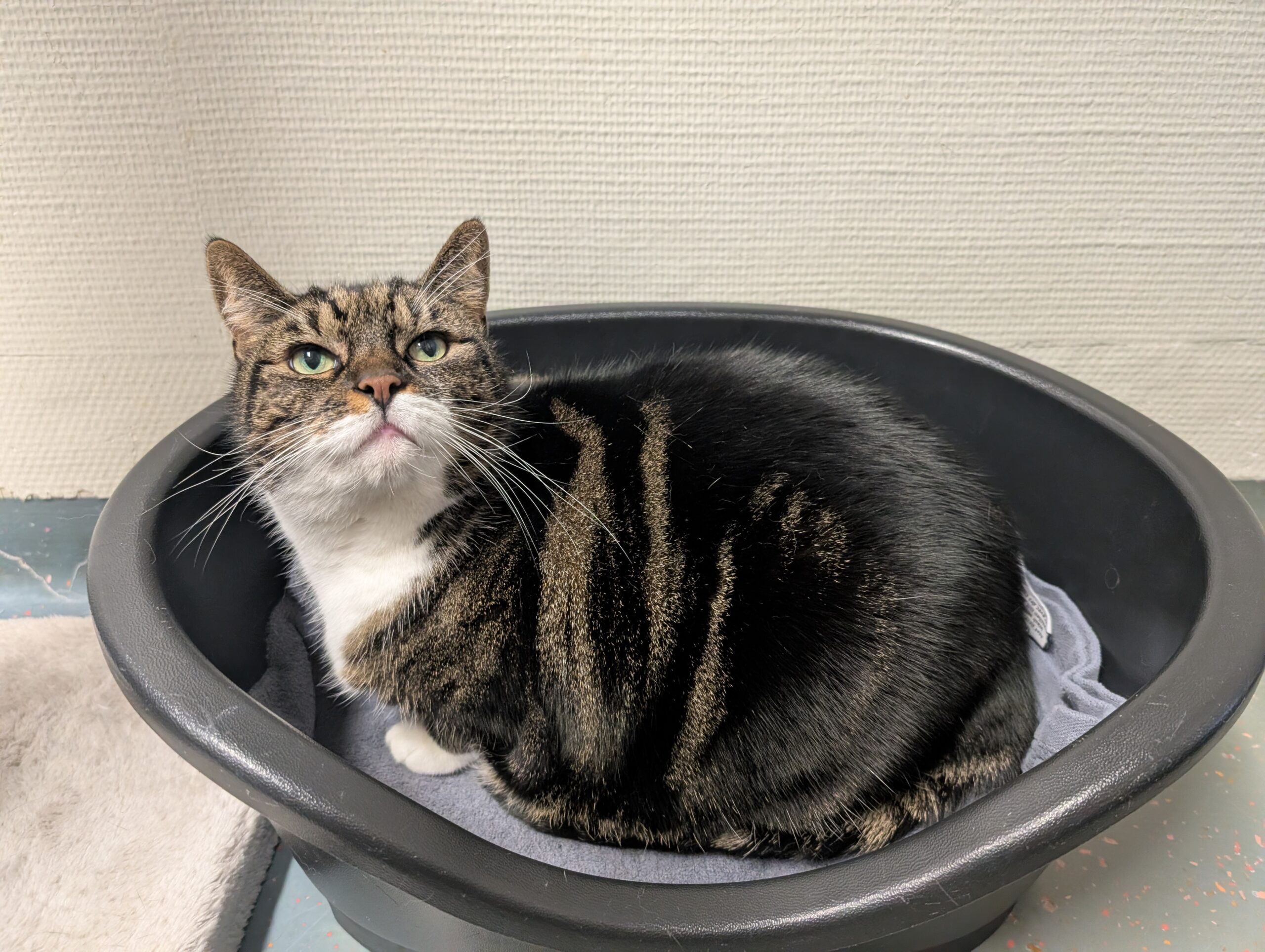 Mijn baasje kon niet meer voor mij zorgen. Daarom werd ik naar Stichting Zwerfdier gebracht. Tijdelijk werd ik door iemand anders verzorgd. Daar plaste ik wel eens naast de kattenbak. Hier bij Zwerfdier ben ik volkomen zindelijk. Al mijn behoeftes doe ik keurig in de kattenbak. Bij binnenkomst was ik van slag. Al die vreemde mensen, rare geurtjes en onbekende geluiden. Maar gelukkig ben ik inmiddels gewend. Daarom vertelde ik de leiding: “Ik ben klaar voor een nieuwe stap in mijn leven. Een nieuw huisje!”